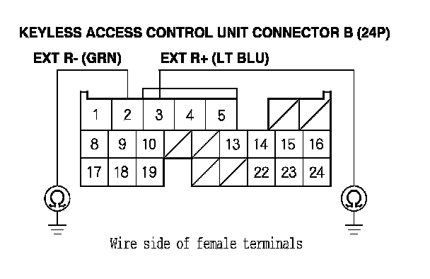 9. Check for continuity between body ground and keyless access control unit connector B (24P) terminals No. 2 and No. 3 individually.