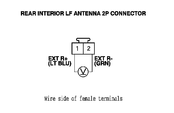 11. Connect the voltmeter between rear interior LF antenna 2P connector terminals No. 1 and No. 2.