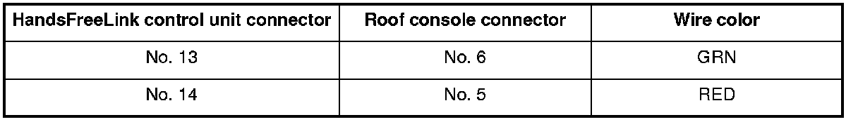 9. Check for continuity between the HandsFreeLink control unit 28P connector the roof console 28P connector according to the table.