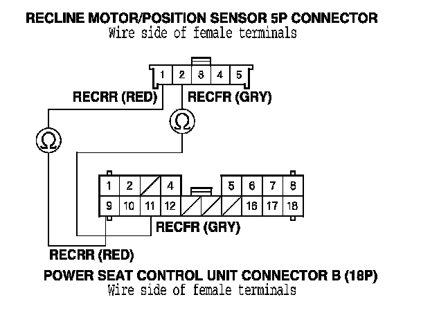 28. Check for continuity between power seat control unit connector B (18P) terminals No. 9 and No. 11 and recline motor/position sensor 5P connector terminals No. 1 and No. 2 respectively.