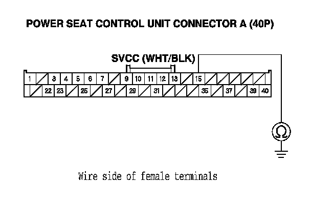 8. Check for continuity between power seat control unit connector A (40P) terminal No. 15 and body ground.
