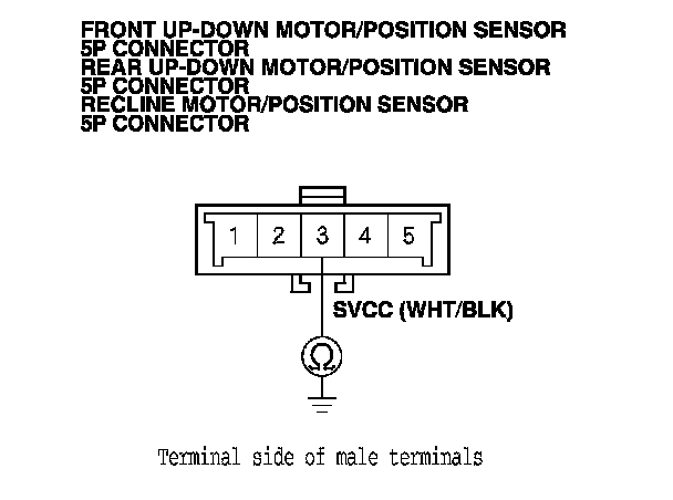 7. Disconnect each 5P connector from the slide motor/position sensor, the recline motor/position sensor, the front up-down motor/position sensor, and the rear up-down motor/position sensor.