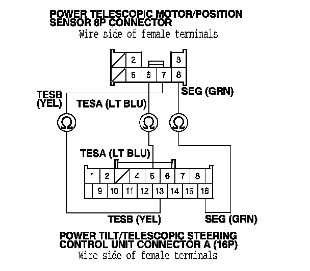 12. Check for continuity between power tilt/telescopic steering control unit connector A (16P) terminals No. 5, No. 13, and No. 16 and power telescopic motor/position sensor 8P connector terminals No. 6, No. 7, and No. 8 respectively.