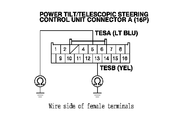 13. Check for continuity between body ground and power tilt/telescopic steering control unit connector A (16P) terminals No. 5 and No. 13 individually.