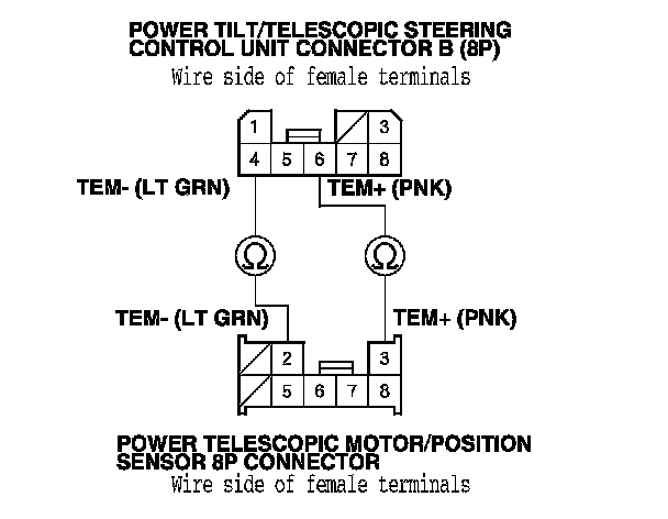 29. Check for continuity between power tilt/telescopic steering control unit connector B (8P) terminals No. 4 and No. 6 and power telescopic motor/position sensor 8P connector terminals No. 2 and No. 3 respectively.