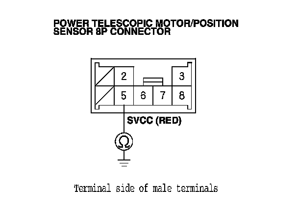 10. At the sensor side, check for continuity between the power telescopic motor/position sensor 8P connector terminal No. 5 and body ground (motor body).