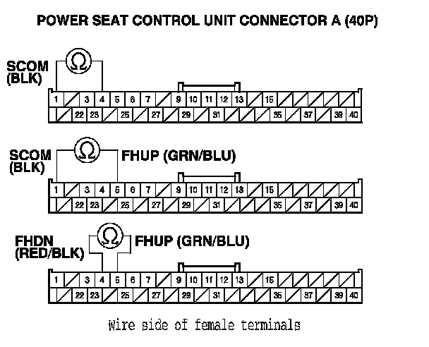 9. Check for continuity between these power seat control unit connector A (40P) terminals: