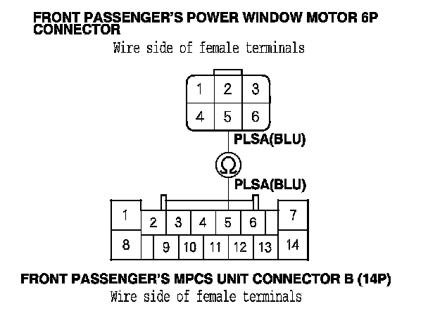 15. Check for continuity between front passenger's MPCS unit connector B (14P) terminals No. 3 and No. 6 and the front passenger's power window motor 6P connector terminals No. 1 and No. 2 respectively.
