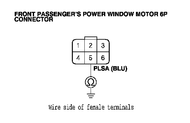 16. Check for continuity between front passenger's power window motor 6P connector terminal No. 1 and body ground.