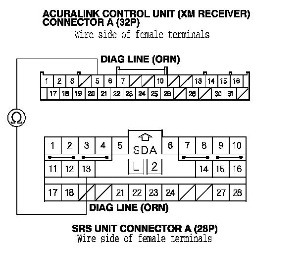 6. Check for continuity between AcuraLink control unit (XM receiver) connector A (32P) terminal No. 5 and SRS unit connector A (28P) terminal No. 13.