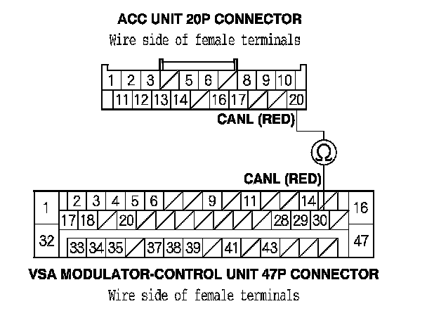 9. Check for continuity between the ACC unit 20P connector terminal No. 20 and the VSA modulator-control unit 47P connector No. 30 terminal.