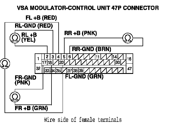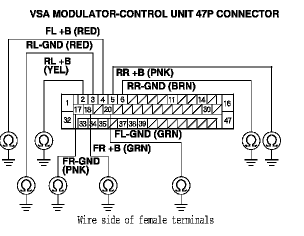 16. Check for continuity between the appropriate +B and GND terminals of the VSA modulator-control unit 47P connector and the relative wheel speed sensor 2P connector.