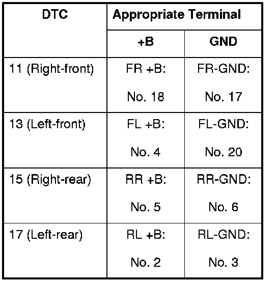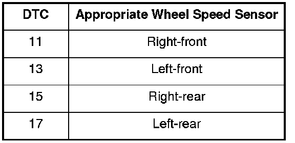 DTC 11, 13, 15, 17: Wheel Speed Sensor (Short to Power/Short to Body Ground/Open)