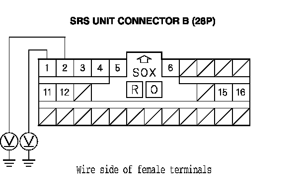 15. Measure the voltage between the No. 1 terminal of SRS unit connector B (28P) and body ground, and between the No. 2 terminal and body ground. There should be less than 0.2 V.