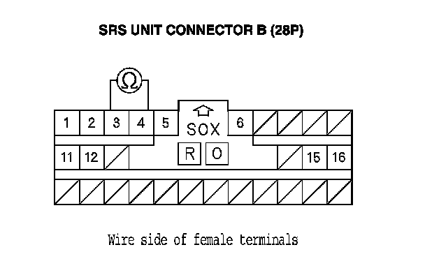 12. Measure the resistance between the No. 3 and the No. 4 terminals of SRS unit connector B (28P). There should be 2.0-3.0 Ohms.