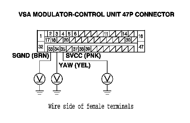 9. Measure the voltage between body ground and the VSA modulator-control unit 47P connector terminals No. 33, No. 34, and No. 35 individually.