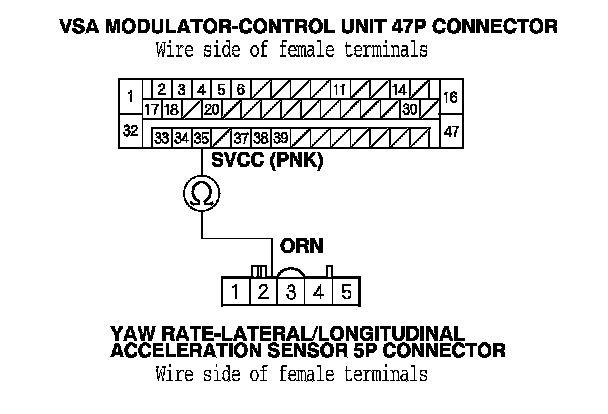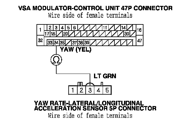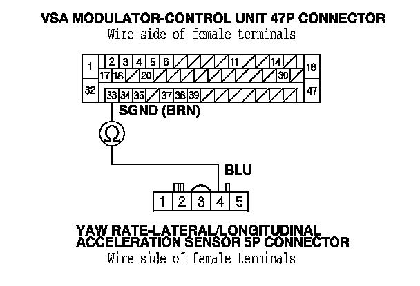 14. Check for continuity between the VSA modulator-control unit 47P connector terminal No. 34 and yaw rate-lateral/longitudinal acceleration sensor 5P connector terminal No. 3.