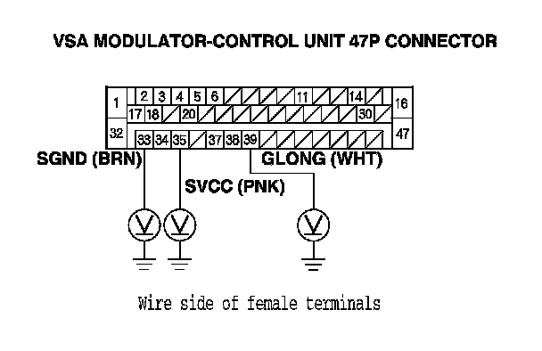 9. Measure the voltage between body ground and the VSA modulator-control unit 47P connector terminals No. 33, No. 35, and No. 39 individually.