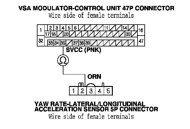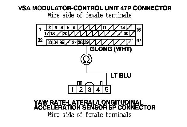 14. Check for continuity between the VSA modulator-control unit 47P connector terminal No. 39 and yaw rate-lateral/longitudinal acceleration sensor 5P connector terminal No. 5.