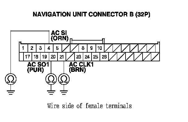 19. Check for continuity between the terminal of navigation unit connector B (32P) according to the table.