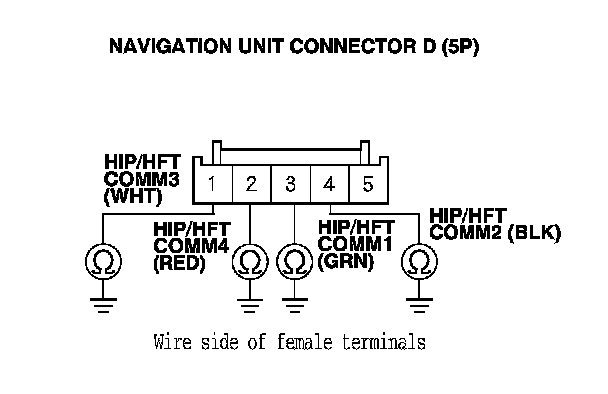 13. Check for continuity between body ground and navigation unit connector D (5P) terminals No. 1, No. 2, No. 3 and No. 4 individually.