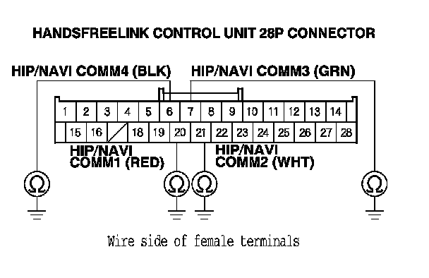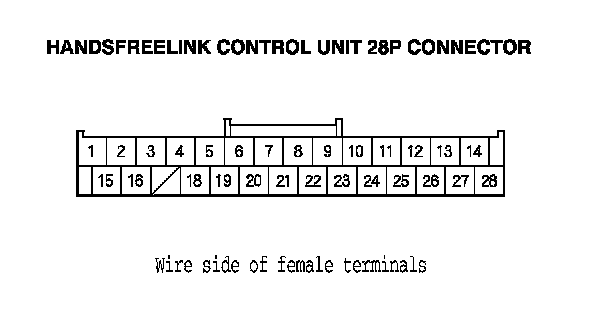 12. Check for continuity between the terminals of the HandsFreeLink control unit 28P connector according to the table.