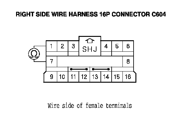 14. Measure the resistance between the No. 1 and No. 7 terminals of the right side wire harness 16P connector C604. There should be less than 1.0 Ohms.