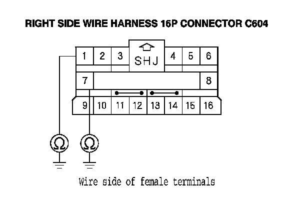 14. Measure the resistance between the No. 1 terminal of the right side wire harness 16P connector C604 and body ground, and between the No. 7 terminal and body ground. There should be an open circuit or at least 1 MOhms.