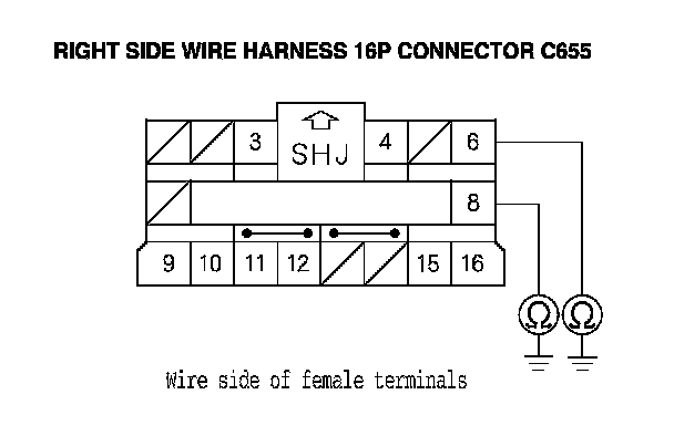 14. Measure the resistance between the No. 6 terminal of right side wire harness 16P connector C655 and body ground, and between the No. 8 terminal and body ground. There should be an open circuit or at least 1 MOhms.
