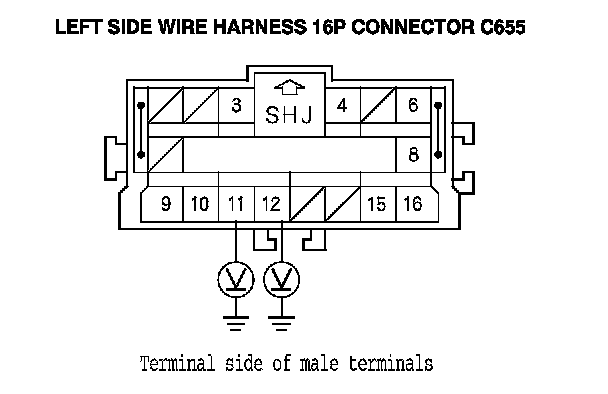 18. Measure the voltage between the No. 11 terminal of left side wire harness 16P connector C655 and body ground, and between the No. 12 terminal and body ground. There should be less than 0.2 V.