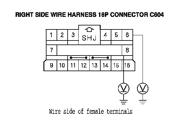22. Measure the voltage between the No. 6 terminal of right side wire harness 16P connector C604 and body ground, and between the No. 8 terminal and body ground. There should be less than 0.2 V.