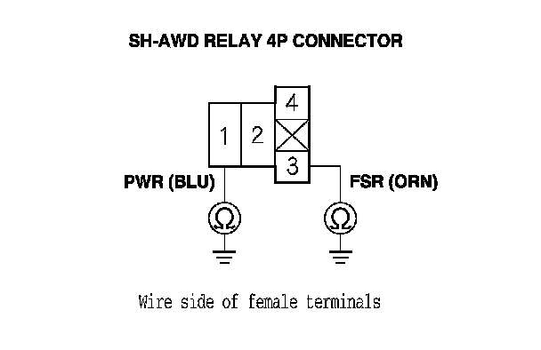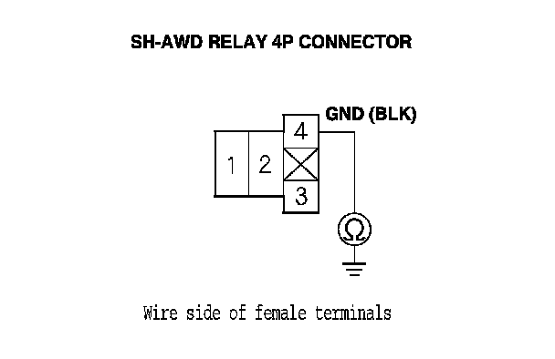 14. Check for continuity between SH-AWD relay 4P connector terminal No. 4 and body ground.