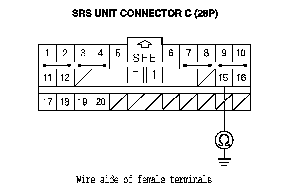 6. Measure the resistance between the No. 15 terminal of SRS unit connector C (28P) and body ground. There should be an open circuit or at least 1 MOhms.