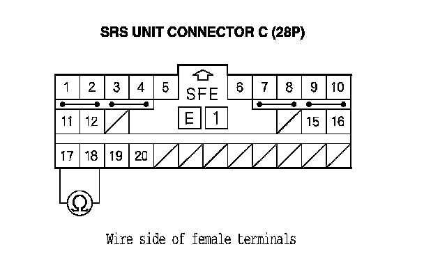 14. Measure the resistance between the No. 17 and No. 18 terminals of SRS unit connector C (28P). There should be less than 1.0 Ohms.