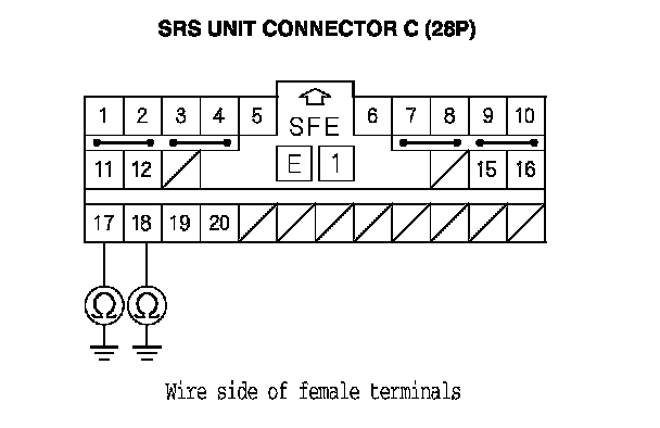 8. Measure the resistance between the No. 17 terminal of SRS unit connector C (28P) and body ground, and between the No. 18 terminal and body ground. There should be an open circuit or at least 1 MOhms.