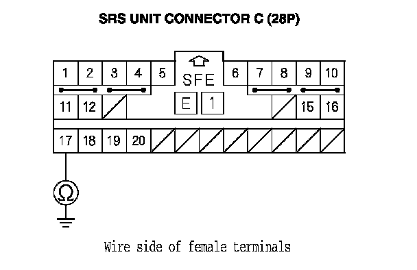 6. Measure the resistance between the No. 17 terminal of SRS unit connector C (28P) and body ground. There should be an open circuit or at least 1 MOhms.