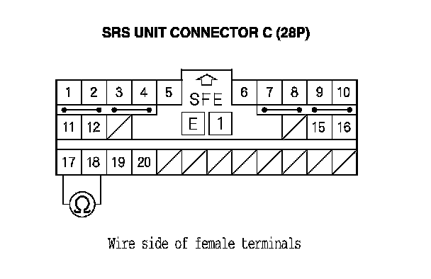 7. Measure the resistance between the No. 17 and No. 18 terminals of SRS unit connector C (28P). There should be an open circuit or at least 1 MOhms.