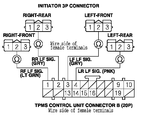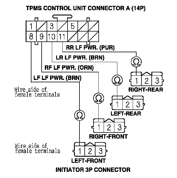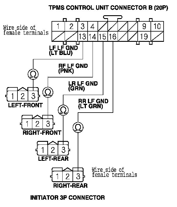 20. Check for continuity between the appropriate terminal in TPMS control unit connector A (14P) and appropriate initiator 3P connector terminal No. 1 (see table).