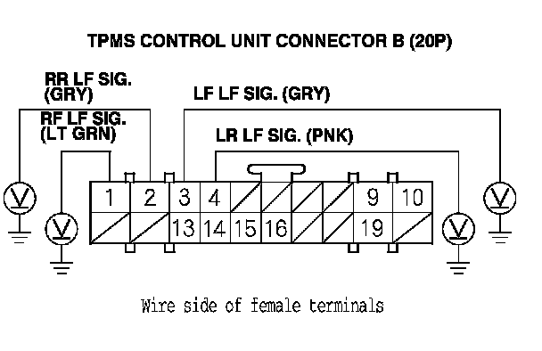 25. Measure voltage between body ground and the appropriate TPMS control unit connector B (20P) terminal (see table).