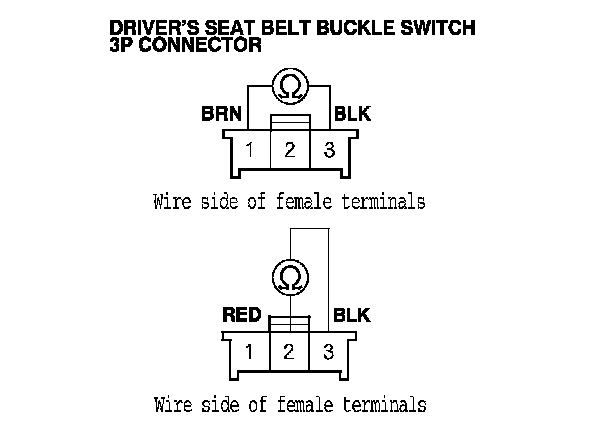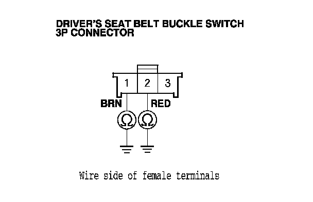 - Measure the resistance between the No. 1 and No. 3 terminals of the left side seat belt buckle switch 3P connector. There should be less than 1.0 Ohms.