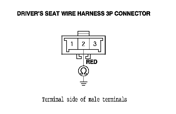 14. Disconnect the driver's seat belt tension reducer solenoid 2P connector. Testing and Inspection Measure the resistance between the No. 1 terminal of the driver's seat wire harness 3P connector and body ground. There should be an open circuit or at least 1 MOhms.
