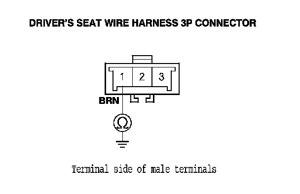 13. Measure the resistance between the No. 2 terminal of the driver's seat wire harness 3P connector and body ground. There should be an open circuit or at least 1 MOhms.