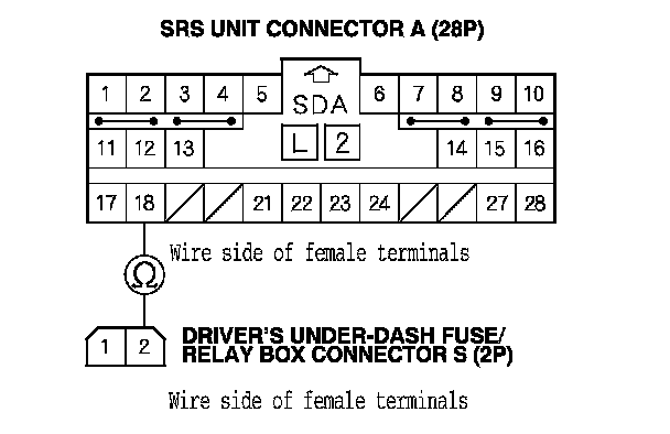 18. Measure the resistance between the No. 2 terminal of driver's under-dash fuse/relay box connector S (2P) and the No. 18 terminal of SRS unit connector A (28P). There should be less than 1.0 Ohms.