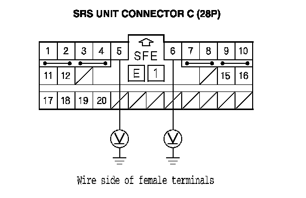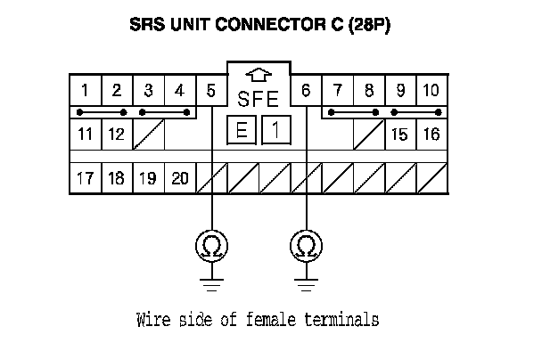 7. Measure the resistance between the No. 5 and No. 6 terminals of SRS unit connector C (28P). There should be an open circuit or at least 1 MOhms.