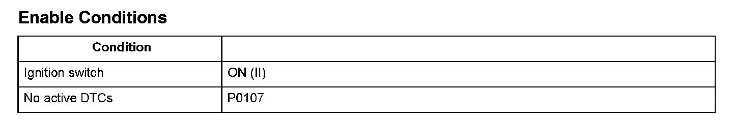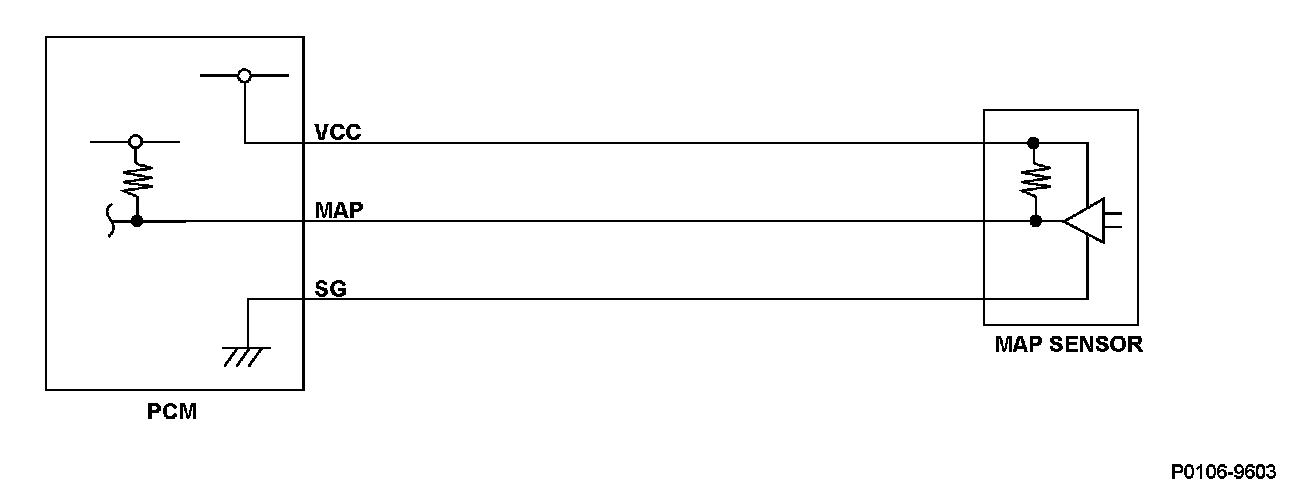 The manifold absolute pressure (MAP) sensor senses manifold absolute pressure (vacuum) and converts it into electrical signals. The MAP sensor outputs low signal voltage at high-vacuum (throttle valve closed) and high signal voltage at low-vacuum (throttle valve wide open). If a signal voltage from the MAP sensor is a set value or more, the powertrain control module (PCM) detects a malfunction and a DTC is stored.