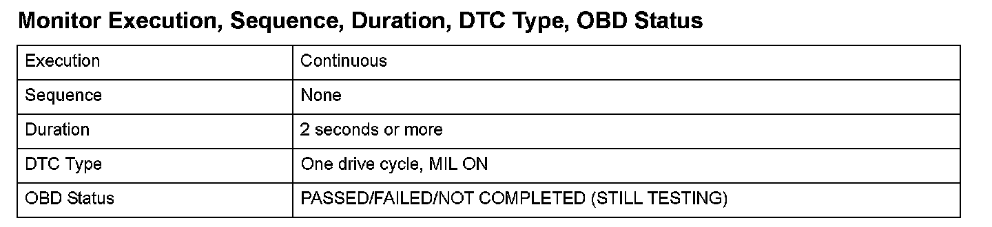 Monitor Execution, Sequence, Duration, DTC Type, OBD Status
