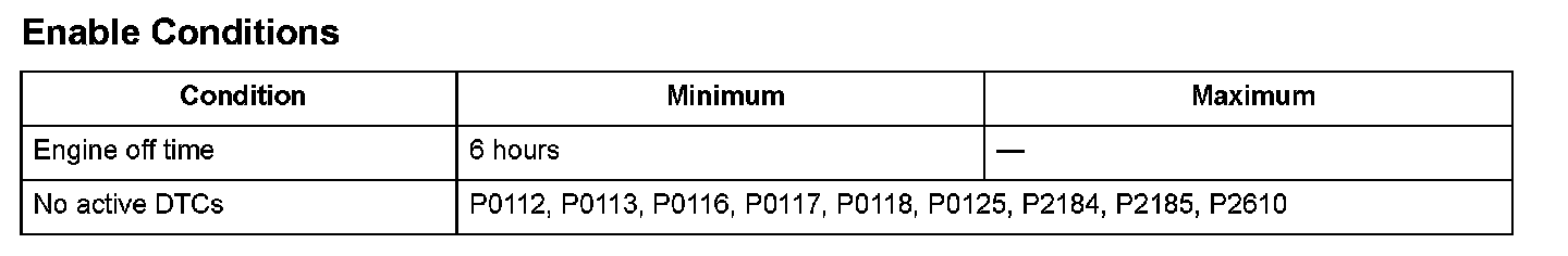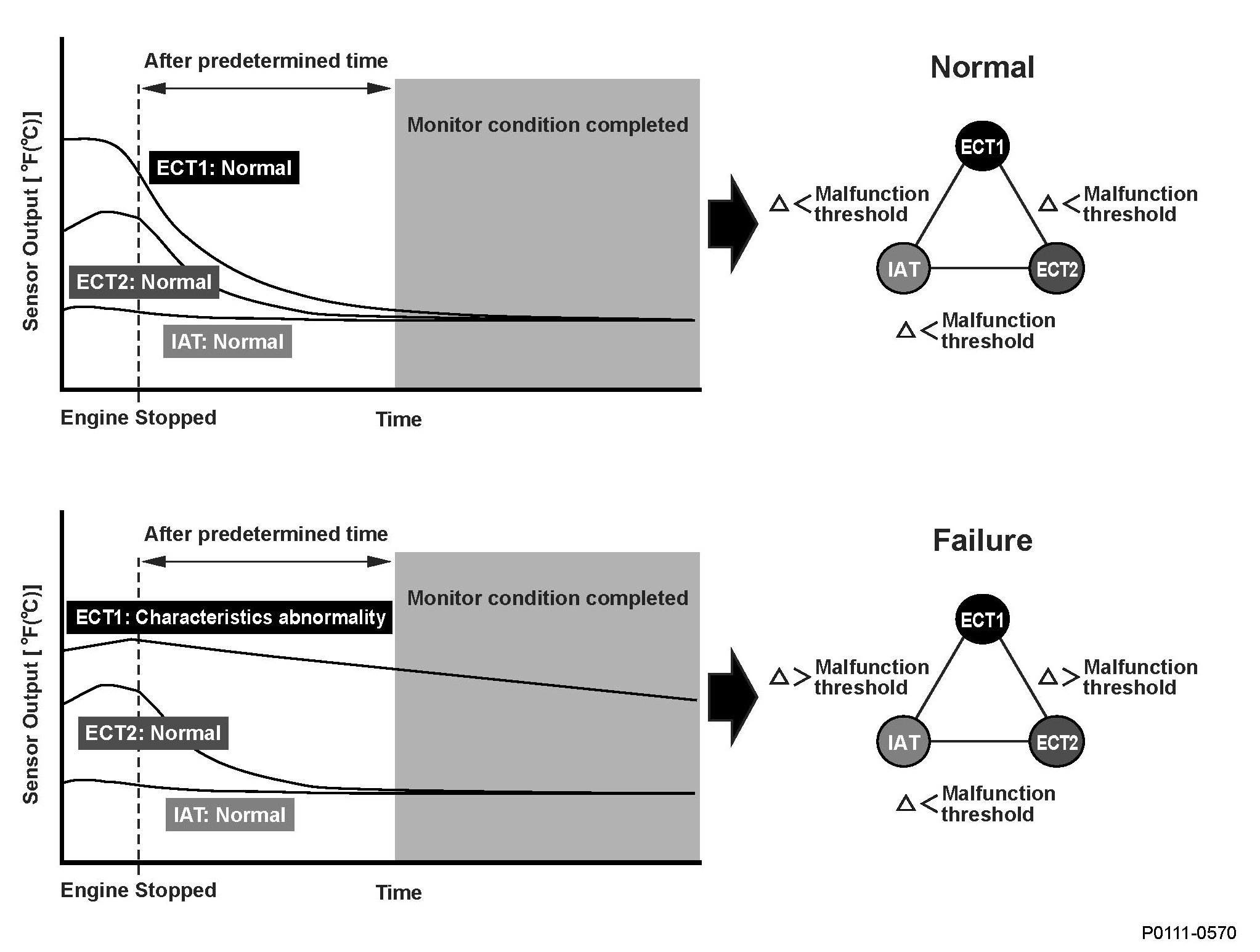 Two engine coolant temperature sensors and one intake air temperature sensor are used by the powertrain control module (PCM). When the engine is stopped and enough time has passed, the temperature of the engine will equalize to the ambient temperature. When an inappropriate temperature is detected after comparing the temperature readings of each sensor, a malfunction in the corresponding sensor is detected and a DTC is stored.