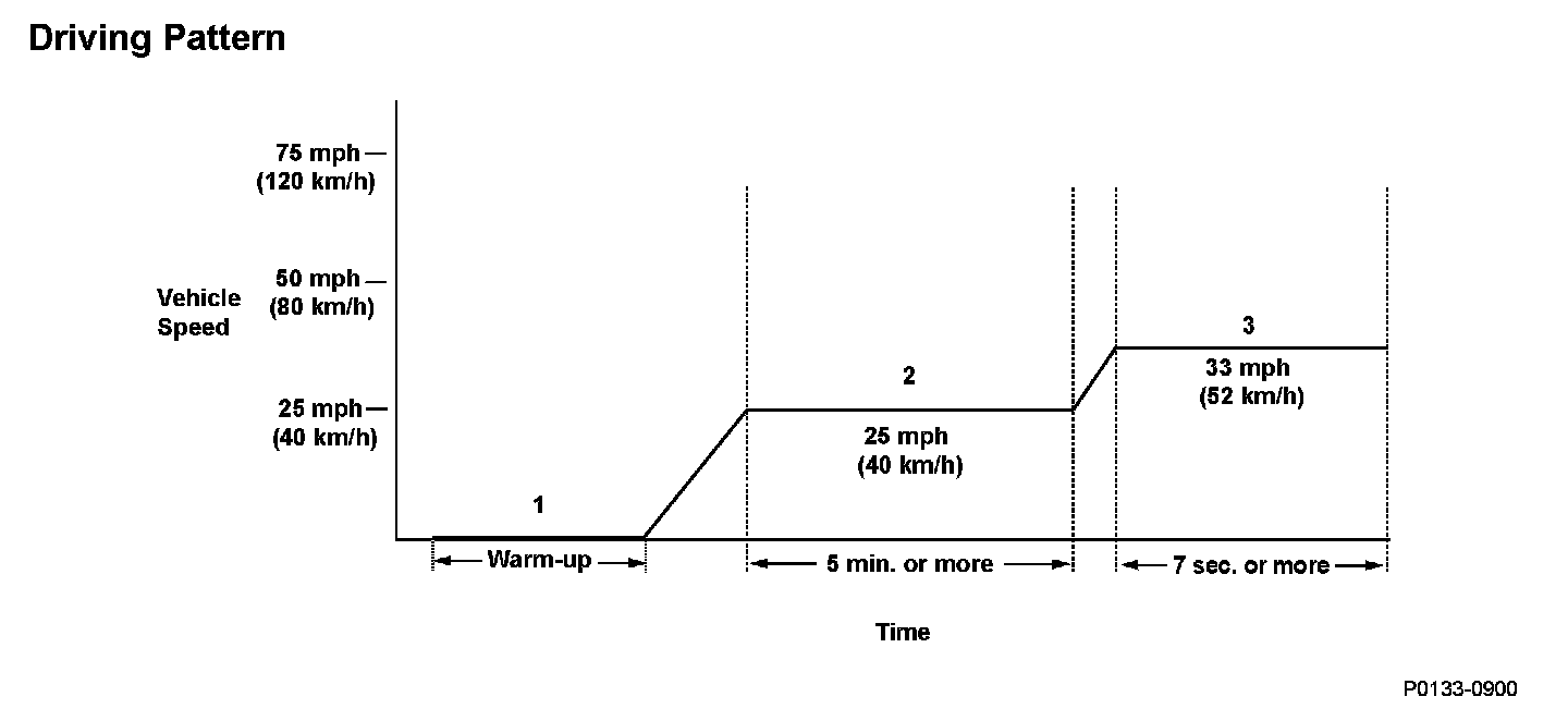 3. Then, drive immediately at a steady speed of 33 mph (52 km/h) or more and engine speed between 1,250 - 2,200 rpm for at least 7 seconds.