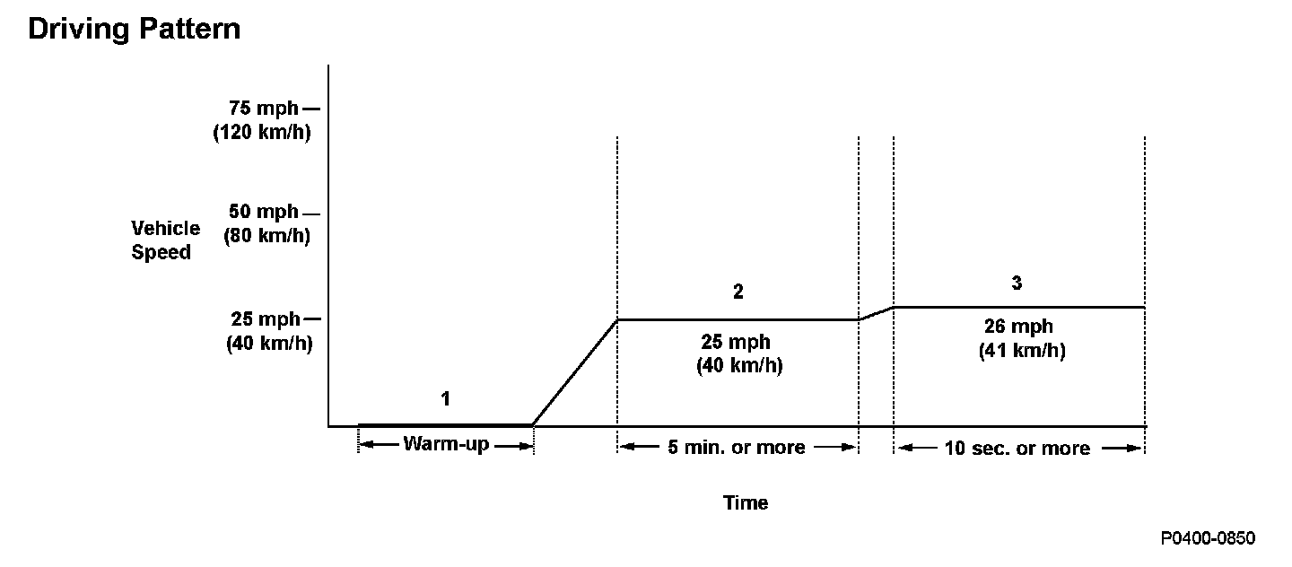 3. Then, drive immediately at a steady speed 26 mph (41 km/h) or more and engine speed between 1,500 - 3,000 rpm for at least 10 seconds.