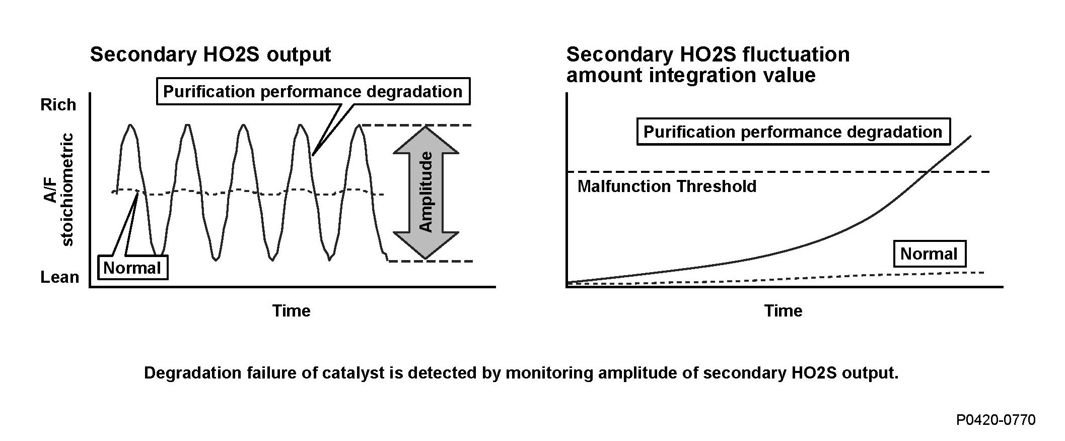 The three way catalytic converter (TWC) converts hydrocarbons (HC), carbon monoxide (CO), and oxides of nitrogen (NOx) in the exhaust gas to water vapor, carbon dioxide (CO2), and dinitrogen (N2). The powertrain control module (PCM) fluctuates the air/fuel ratio (A/F) temporarily to detect the purification performance of the TWC and measures the degree of fluctuation in the secondary HO2S output. If the accumulated value for a set time is too great, deterioration of purification performance of the catalyst is detected.